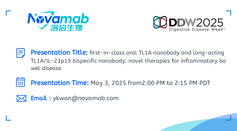 中国上海,2025年4月28日——上海mksport官网生物医药技术有限公司,一家致力于纳米抗体创新药研发的生物技术公司宣布:mksport官网生物将于当地时间5月3-6日参加在加利福尼亚州圣地亚哥举行的2025年美国消化疾病周(Digestive Disease Week,DDW)。届时mksport官网生物将展示在炎症性肠病(IBD)治疗领域的突破性研究成果——口服TL1A纳米抗体及长效TL1A双特异性抗体的开发进展。该创新疗法顺利获得独特的TL1A纳米抗体技术,实现了对IBD病理机制的精准靶向。